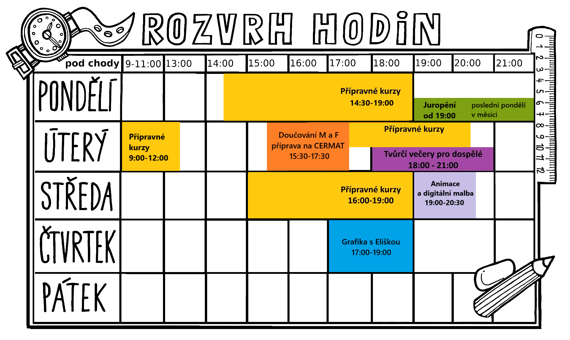 - Přípravné kurzy k přijímacím zkouškám na umělecké školy se koná v pondělí od 15:00-18:00